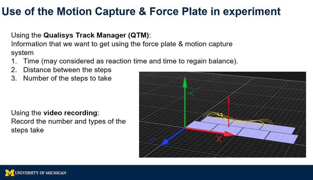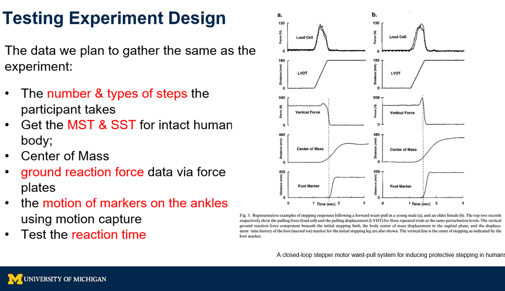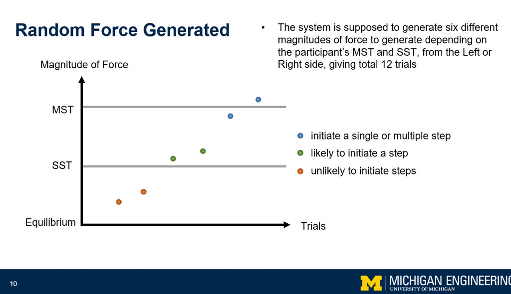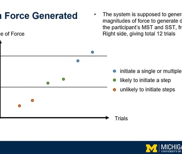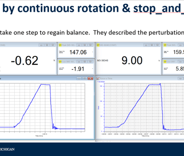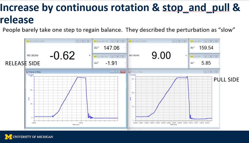 The perturbation system delivered controlled mediolateral perturbations. Motors, controlled through stepper driver and LabVIEW, work in equal and opposite directions to pull the participant, ensuring directions and magnitudes of perturbations could be randomized and blinded. A waist harness with embedded force sensors was connected to the stepper driver to read perturbation force. The force plates and waist force sensors ensured the participant reached a steady state of equal weight bearing through both limbs before the start of each perturbation. A randomization algorithm was used to control the direction and magnitude of each perturbation.