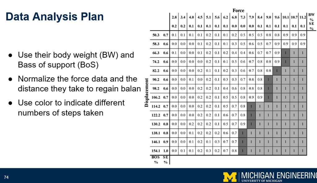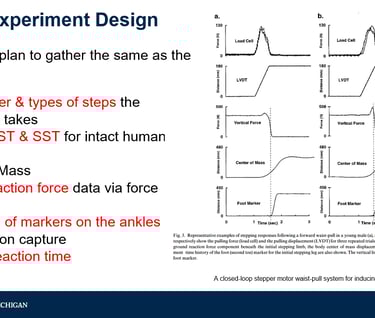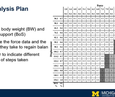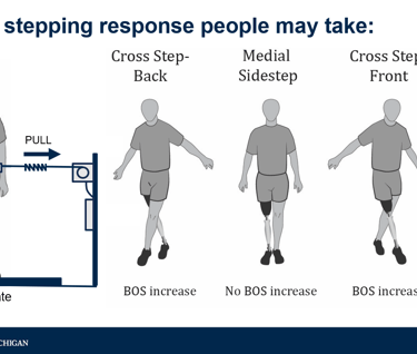 A motion capture system was integrated to capture stepping responses and in-ground force plates to define step onset through a thresholding algorithm from ankle marker positions. The center of pressure position at step onset was calculated relative to the non-stepping limb ankle and normalized to the width of BoS. Recovery duration was determined for each step response.