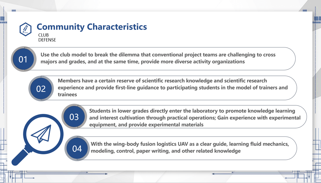 In 2021, I founded a club with a primary focus on designing Unmanned Aerial Vehicles (UAVs) to engage junior college students to gain early research experiences, under the . The club attracted around 30 students at first, and we organized a series of activities to provide comprehensive education in UAV design. These activities encompassed hands-on flying exercises, workshops on carbon fiber and 3D printing, and utilization of the wind tunnel lab, etc. As a testament to our commitment and accomplishments, our club was awarded the highest honor on campus, as a "five-star" club. Through this initiative, I sharpened my leadership and organizational skills while inspiring and mentoring aspiring engineers.
